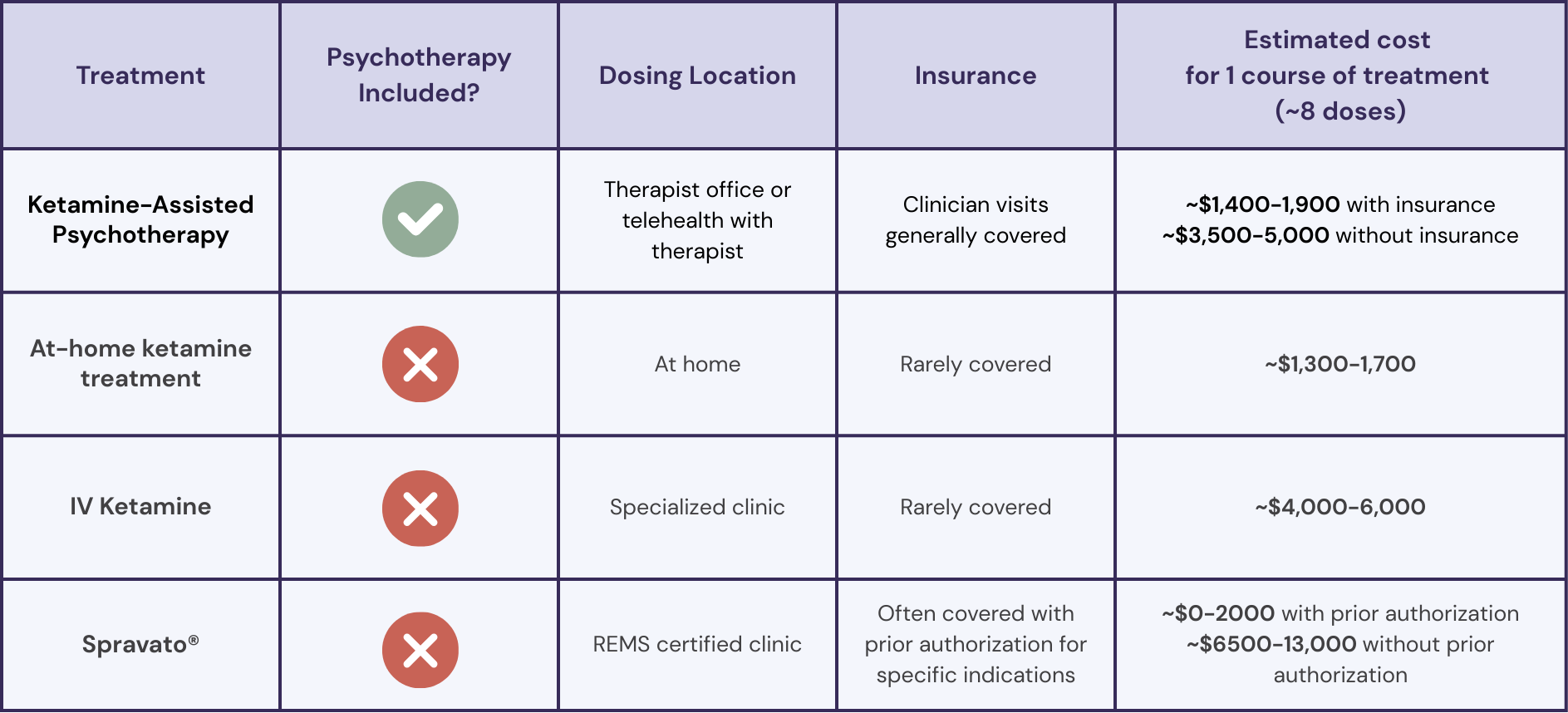 See how KAP compares to other ketamine treatment options in terms of cost, psychotherapy, and insurance coverage.